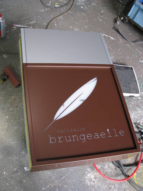 小型の看板の外装をシート貼りすると、意外と仕上げが悪く見えてしまうので、シートを裏面に曲げ返さずに、板の厚みを近似色で筆で塗装するなどの工夫を施しています。