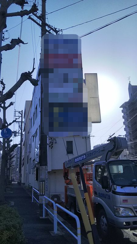 12mの後方格納タイプの高所作業車を用意したのですが、看板の左上角に1mほど届かずにヒヤリ笑
