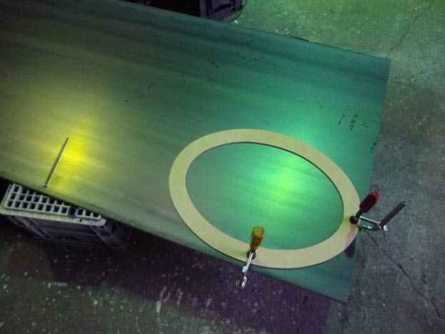 2.3tの鉄板を楕円に切り出すのにあたり、ベニヤで型を作ってプラズマで切り出しました。