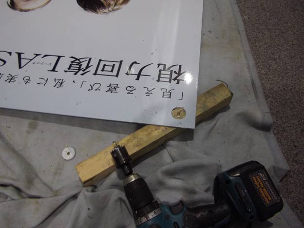 既設の埋め込みの飾りビスを貫通させるため、現場で測ってホルソーで穴あけ。