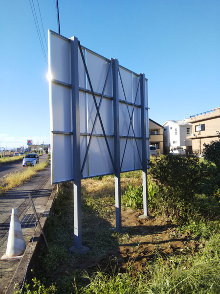 創業当初からアルミの溶接枠を自社製作してきた弊社ですが、ロードサインや、ロードサインと同じようなパネル式の建植看板の場合、以前はアルミ枠を使うことはまずありませんでした。価格のわりにメリットが少ないのが理由です。