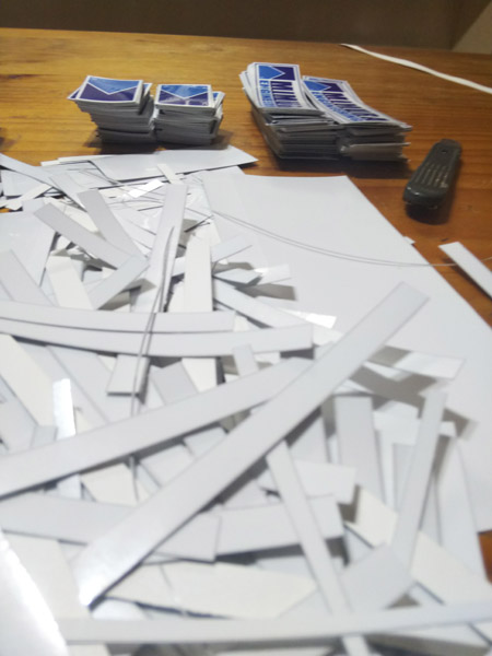 通常はステッカーの輪郭形状に機械でマシンカットするところ、裁断機で切っていることだけが違います。素材や印刷品質は同じです。