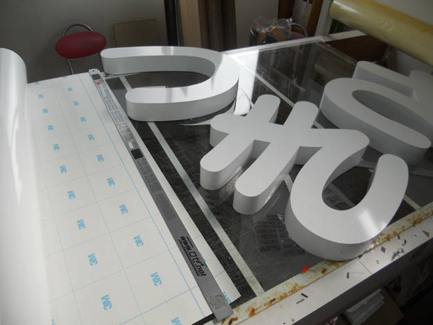 弊社は箱文字も自社製作することがありますが、今回は本職にお願いしました。ここで貼っているシートも3M。他のメーカーでもいいかな、とは思ったのですが、バックが3Mなので、文字の方もより信頼の高い3Mを選びました。