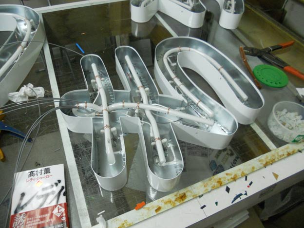 この手のバックネオンをLEDでやると、結構なお値段になってしまうのですが、ネオン管だとそこそこで収まります。ただ、高圧のネオンだと離隔距離の問題とかがあって、小さい文字は難しいです。
