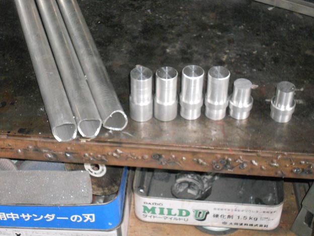 左の丸パイプは、パイプを直角に組んで溶接するために切り欠きしたもの。