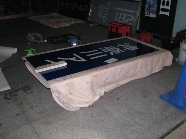 このクソ寒いのに扇風機を回して乾かします。まさかお客様も、朝9時から取り付ける看板が、前日の晩10時にこの状態だとは思わないでしょう(笑)。