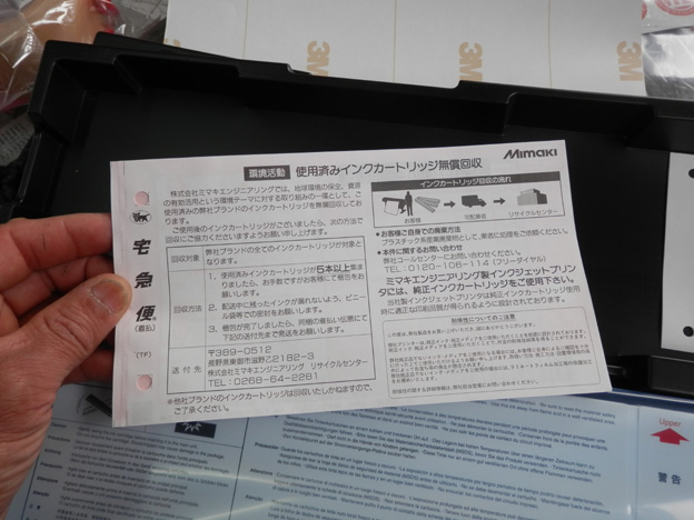 看板用のプリンターのインクカートリッジは、メーカーが無償で引き取ってくれます。宅急便の着払い伝票で送り返すのです。