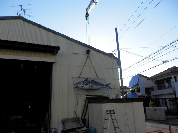 真っ先に取り掛かったのは、レッドブルボックスカートレースのために製作した焼き魚カート。分解して、足回り部品はダウンヒルダービー用に保管。焼き魚は弊社工場壁面に取り付け(笑)。