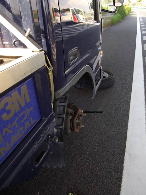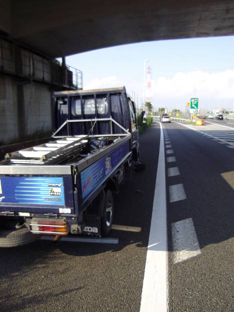 現場帰りの高速道路で、トラックのタイヤがバーストしてしまいました。