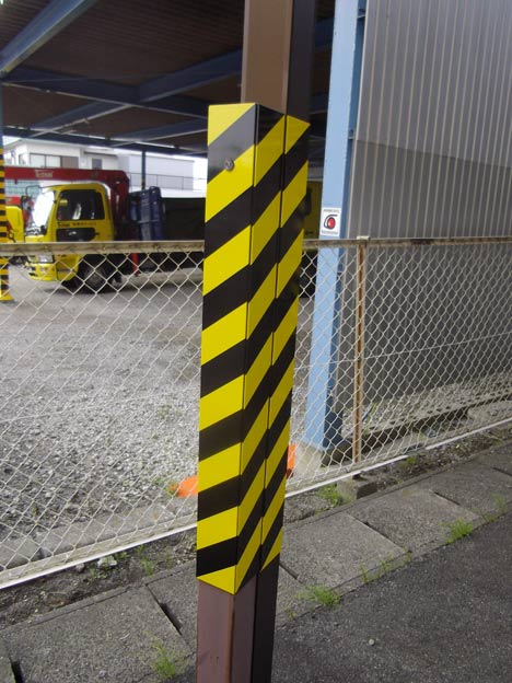 カーポートの支柱にはトラ模様のアルミ複合板を取り付け。