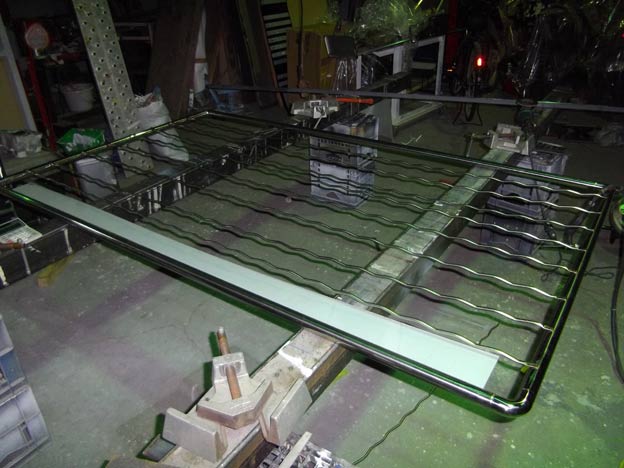 こちらは32φのSUSパイプで、四隅はネック付きエルボを使用。普段はトメ加工が多いですが、エルボだと楽ですね。