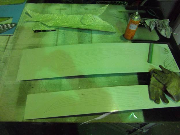 通常はワックスを使ったり離型材を使ったりするのですが、ヒレは真っ平らなので、アルミ複合板の端材に透明のリタックを貼って離型処理としています。