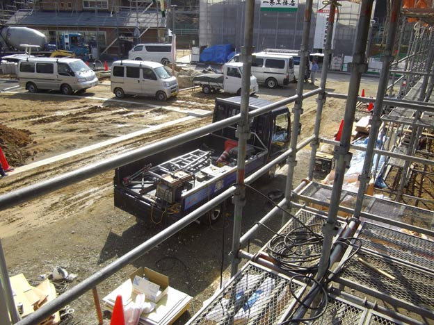 足場から見た弊社のトラック。