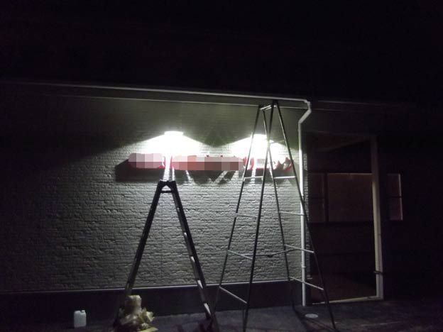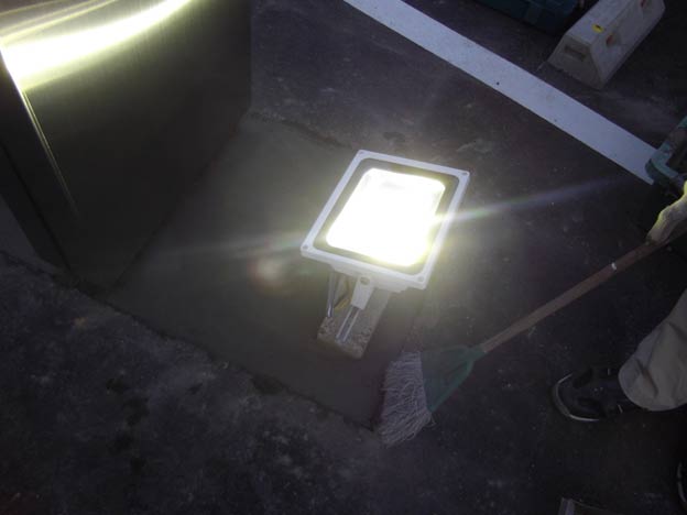 この前日に別のお客様の所にエコナイターS-50のサンプル機を持参して、実際に照らしてプレゼンをしました。その時はメッチャ明るく感じたのですが、ここではステンレス面板がテカッてしまい、文字が目立ちませんでした。