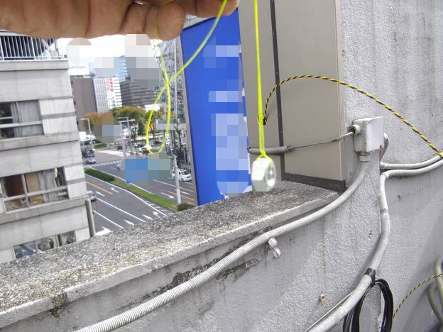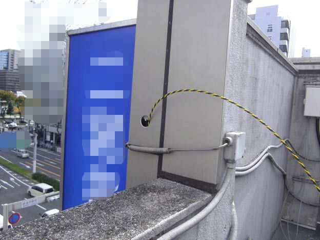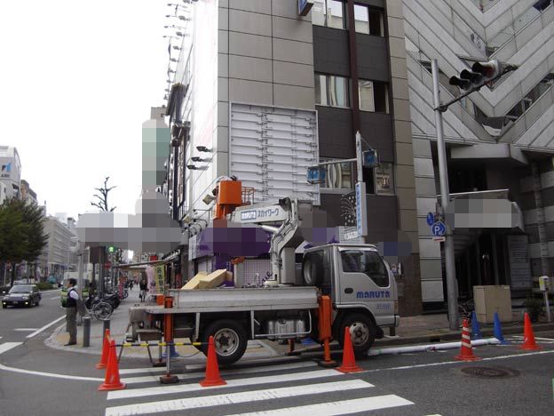 また、現場が丸っきり繁華街で作業車1台くらいしか設置できない上に、ビル1Fに入居している店舗が営業しているので、足場を組む事もできません。