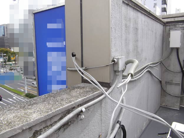 屋上に設置した盤から配線(VAコードを3本)降ろすのですが、パネル内部を通す筈が、なかなかスチール(電線通し用のワイヤー)が通りません。