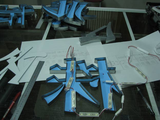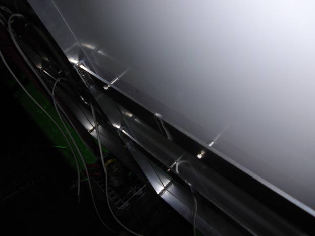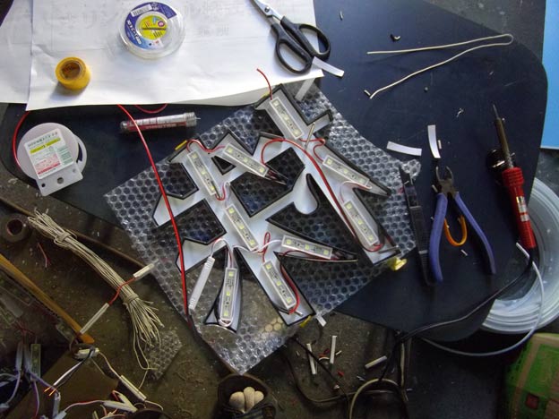 当初は文字型に切り抜いて取り付けるつもりだったのが、重量増加を嫌って、屁のツッパリでモジュール毎にしました。でも、どうやら文字型に切り抜いた方が良かったみたいです・・・。