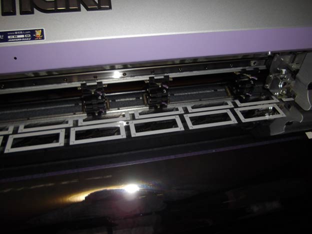 ミマキの複合機の場合、センサーがトンボを読み取って位置決めすることろ、基本的には白いフィルムに黒いトンボでなければならないはず。