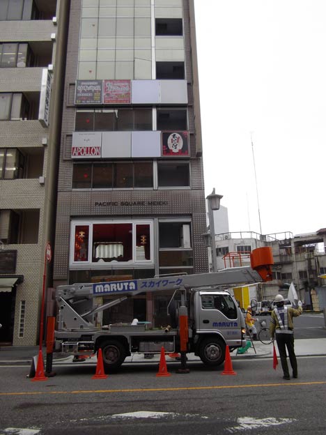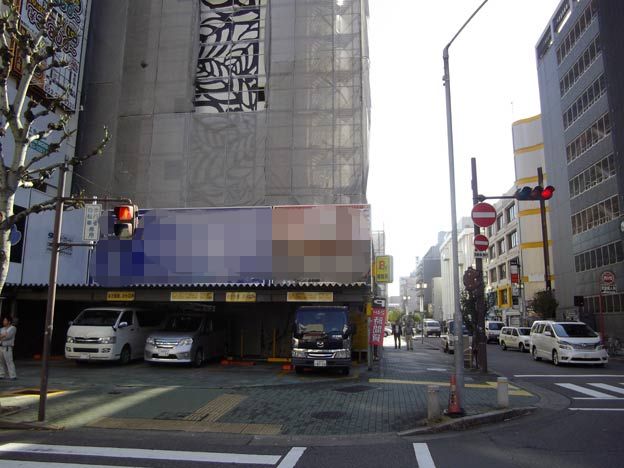 現場に到着してビックリ!! 隣の建物に足場が架けられており、隙間がなくなってしまっているので看板の裏に入って行けませんがな!!