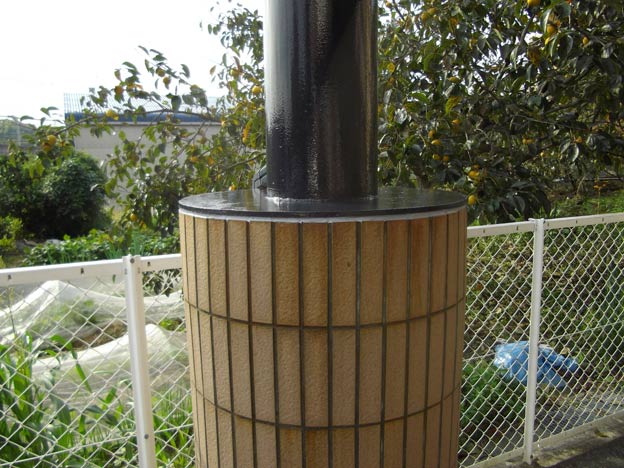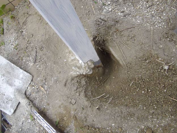 このまま放置すると根元の水はけが悪くなって支柱が腐ってしまいますので、一度掘り返してモルタルを流しこみました。