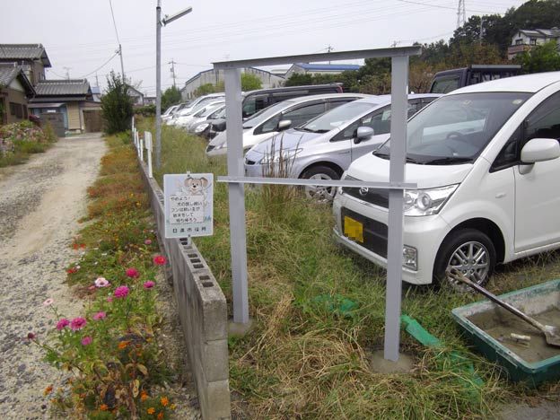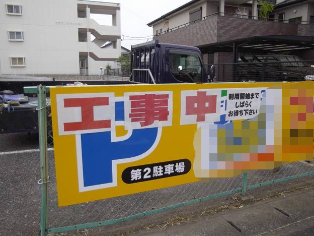 駐車場そのものはまだ工事中なので、紙で「工事中」の表示をしました。パウチしてあります。