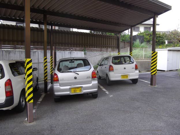 カーポートの支柱にはトラ模様のアルミ複合板を取り付け。