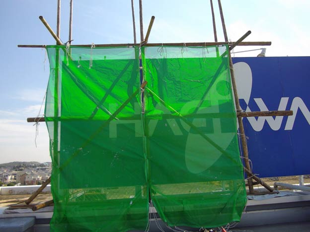 ちなみにこの屋上広告板は、下部が一部分階段室に掛かってまして、丸太を縛る場所がありません。