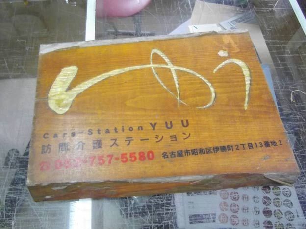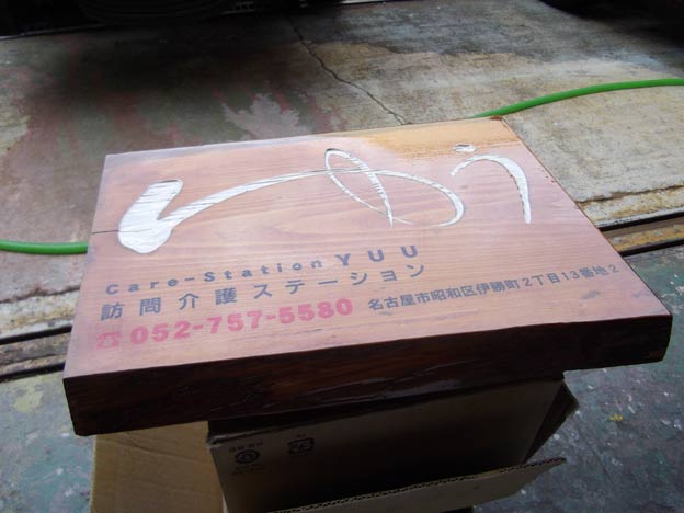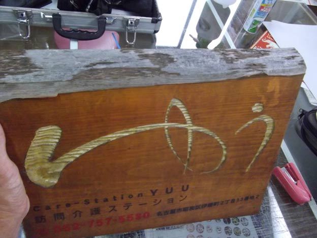 速攻で引き返して、先日工場で塗りなおした「ゆう」様の木彫り看板を取り付けました。ちょうど帰り道に寄れる場所なので助かりました。慌てていたので写真を撮り忘れました