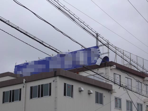 弊社のお向いの一流企業様の屋上看板のトタンがペロリ~ン。