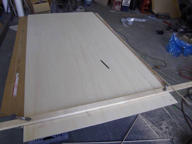 押しピンの針の長さは10mm以上あるので、本当はそれ以上の厚みのベニヤを使う必要がありますが、今回は取り付け強度があまり見込めないので、軽くするために5.5tを使用。