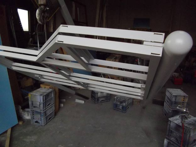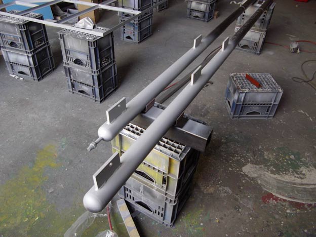 丸パイプの支柱に半球キャップを溶接。組み立て用のプレートも溶接してあります。