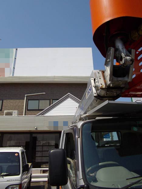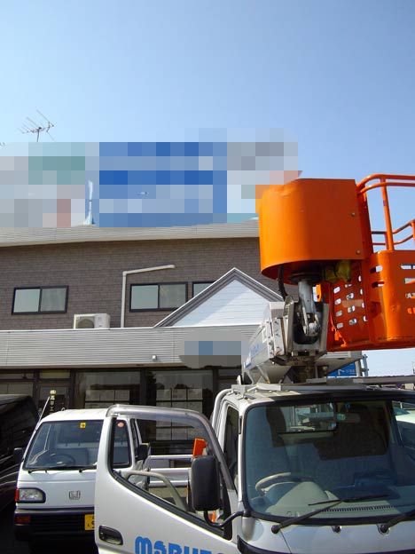 二階の屋上なのでバケット車で施工です。