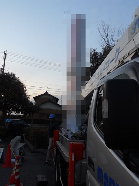今回は27mのバケット車を使用したのですが、最初に設置した場所から作業箇所まで届かず、ヒヤリとしました