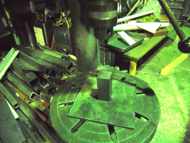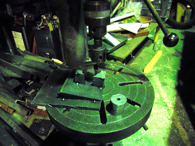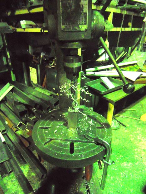本当は旋盤で開けた方が正確な位置に開けられるのですが、3つ爪チャックしかないため、四角い物は咥える事ができないのと、機械が非力なのでほぼ無理です。