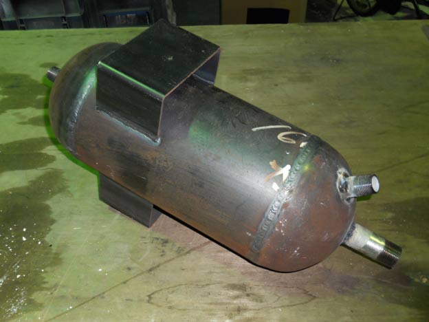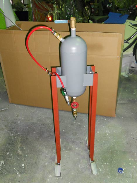 ネットで調べるとこの程度のサイズのタンクを製作された方が多かったので、今回製作した物も約5リッターくらい。でも、仕事で使用するにはもっと大きくても良かったかも。(弊社のコンプレッサーは3馬力70リッターくらいのタンクで、更に70リッターのサブタンクを使っていますので参考まで)