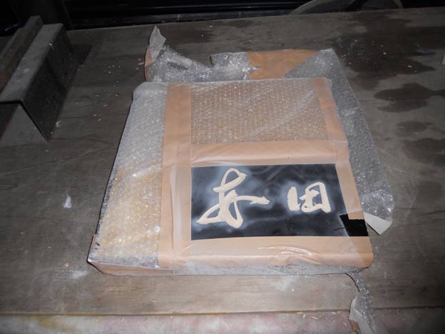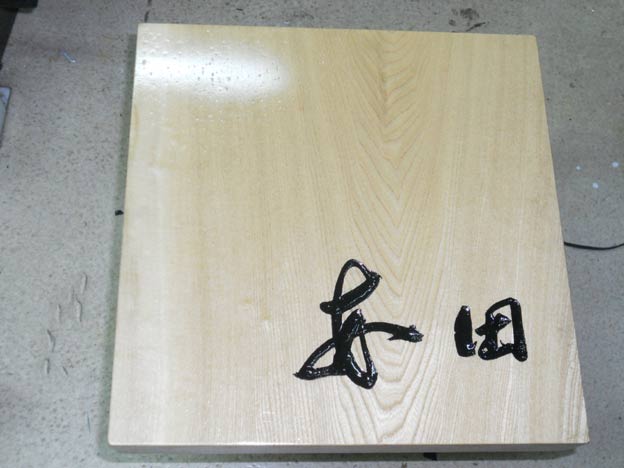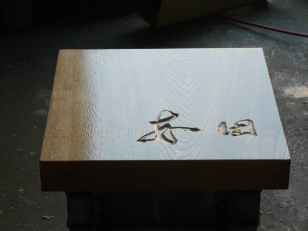 無垢の欅です。40cm角です。ここに書家の方が書いた文字を彫ります。