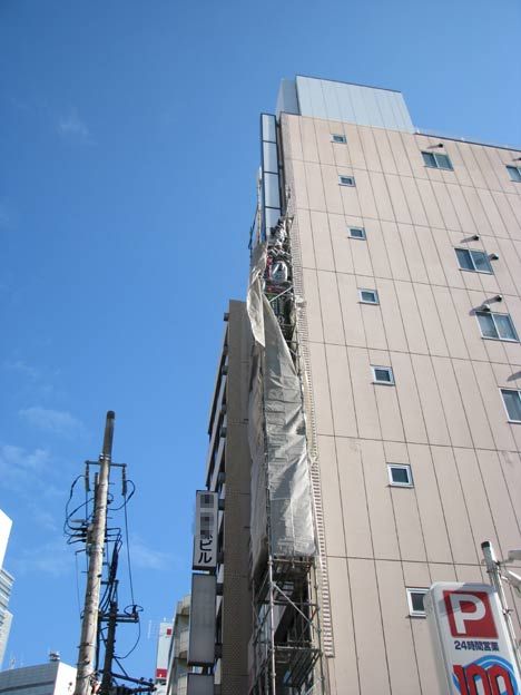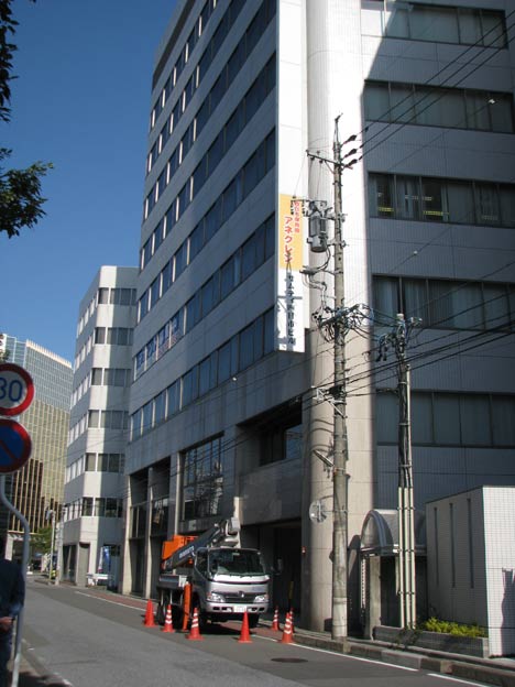 最近よく施工に行くビルで、袖看板の表示入れ作業です。