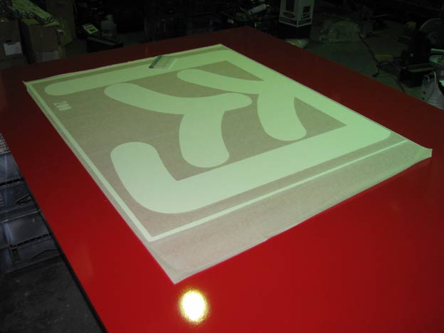 予め製作したパネル(1500*3600)に、赤ベタを貼りました。やはりインクジェットの色より鮮やかですね。