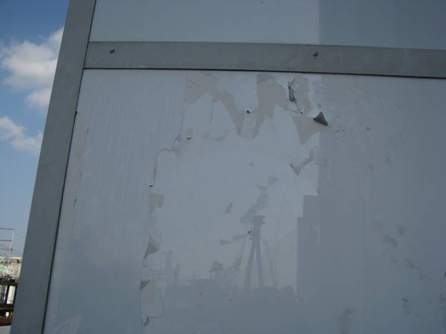 そのテナントが退去時に、カッティング文字だけを剥がして、しかも文字の形に糊が残った状態の上に白シートを貼ってありました。酷い施工です。