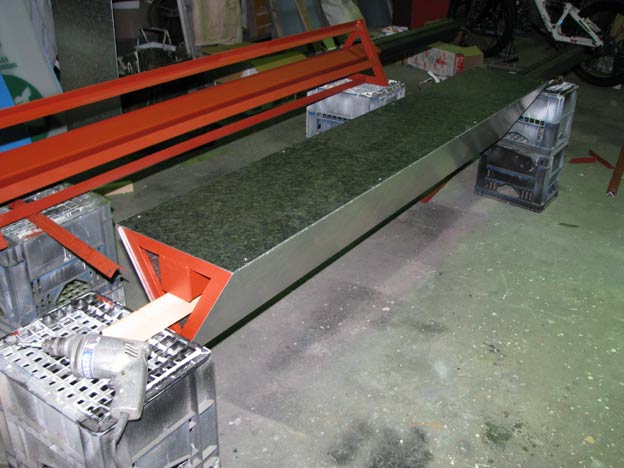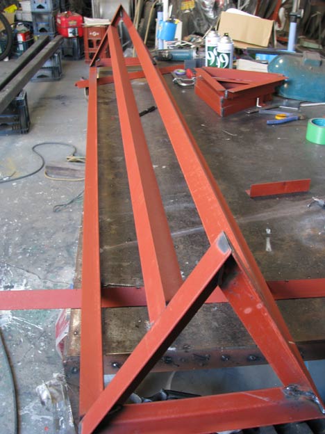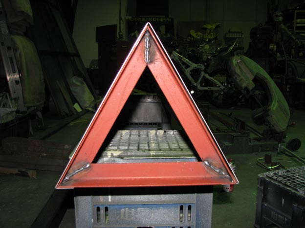 三角に折り曲げた亜鉛鉄板1.2tをビスで固定して、本体の出来上がりです。