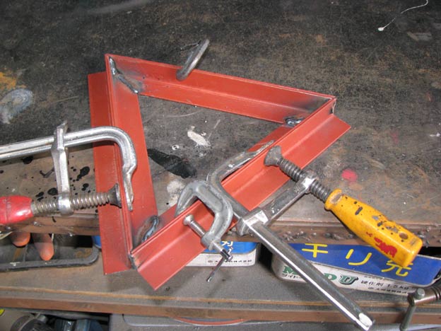 中身のフレーム製作用に、簡単な治具を製作。アングルを三角に組みます。