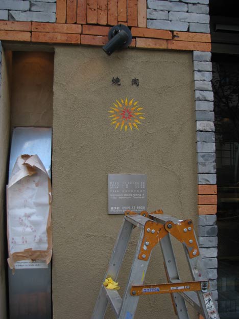 突き出し行灯。取り付けで、問題発生。取り付け場所の強度が思ったほど高くなく、この後で振れ止めの金具を追加する事になりました。