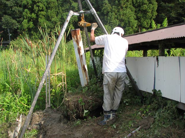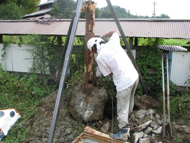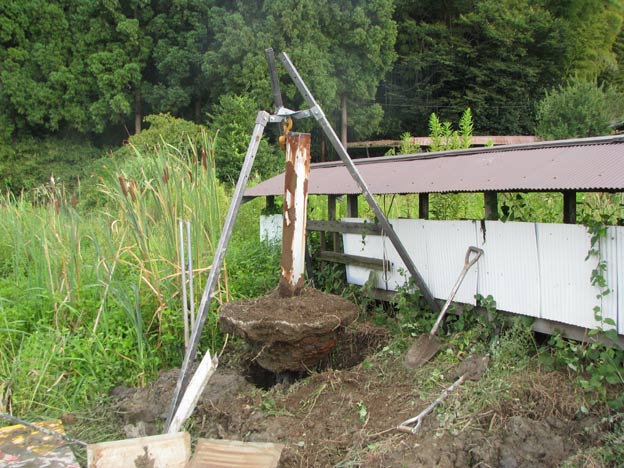 ある程度周りを掘ってやれば、1.5t吊りのチェーンブロックで、比較的簡単に引き抜き可能です。