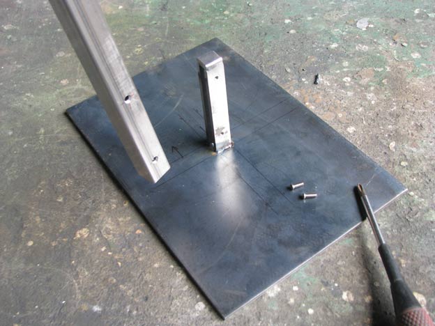 ベースプレートから角パイプが立っている形状なので、ベースプレートに角パイプを溶接してしまうのがイージーなんですが、肉厚が極端に違うもの同士を溶接すると、経年後に、肉薄側の溶接2番(溶接で熱影響を受けた場所)の横にクラックが入ってしまったり、根元付近で曲がってしまったりするので、組み立て式にしました。