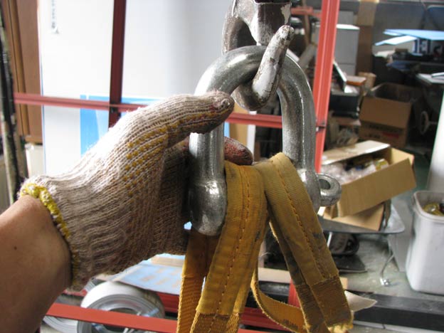 何故かこんなにバカでかいシャックル(1インチ、2t吊り)を使っています。何故かといいますと、いつも行くネジ専門店で見つけて、欲しくなったから(笑)。現場で小物を吊る時に、こんなデカいシャックルを使っていたらウケるだろう・・・という理由だけ!!! ウヒヒ