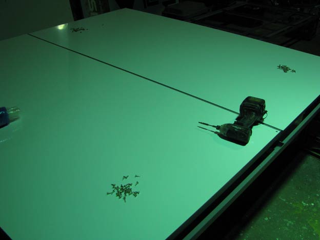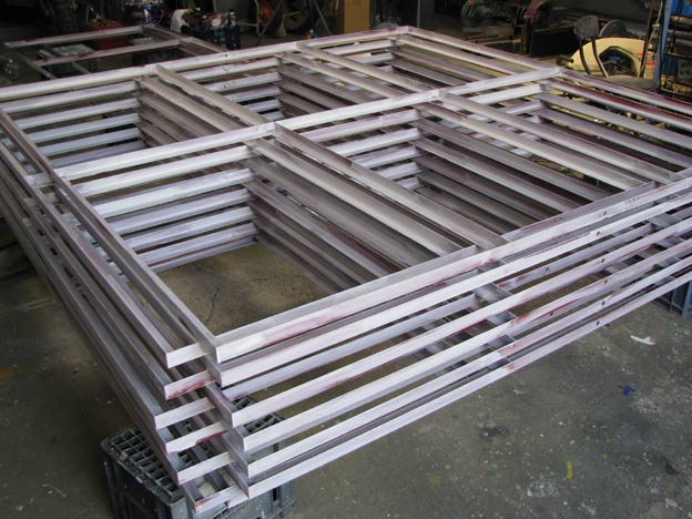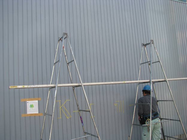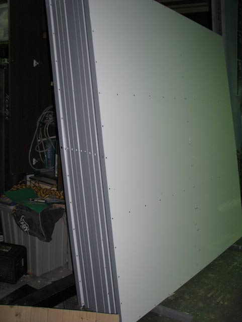 細切れに分割製作したフレームに、アルミ複合板を張っていきます。