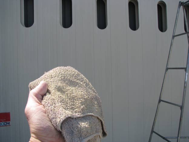 既設壁面はチョーキング(塗装面劣化による粉吹き)が激しいので、クリーニングから。