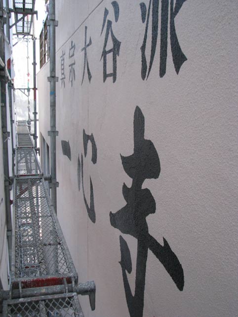 お寺の外壁を再塗装工事されるとの事で、足場が設置されているうちに壁面に文字入れを・・・というご依頼。