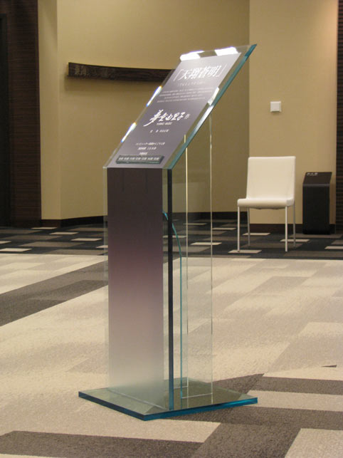 表示は文字の入った面が白塩ビメディアのインクジェット出力貼り、垂直面は透明メディアのインクジェット出力貼りです。