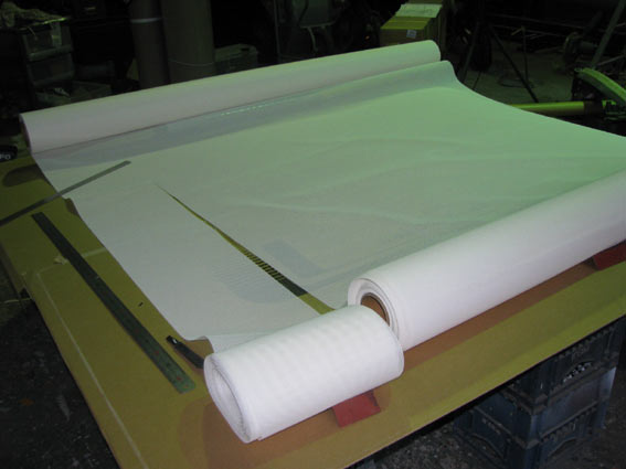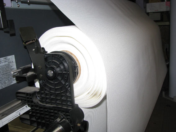 当初、材料屋さんの営業の方と打ち合わせをしたところ、「スリット」(メディアをロール状のまま必要巾に切断する事)出来る・・・との事で、「1900巾のメディアを1600巾にスリットして下さい」と注文したのですが、ターポリンのスリットは特別なようで、時間的に納期に間に合わないとの事。